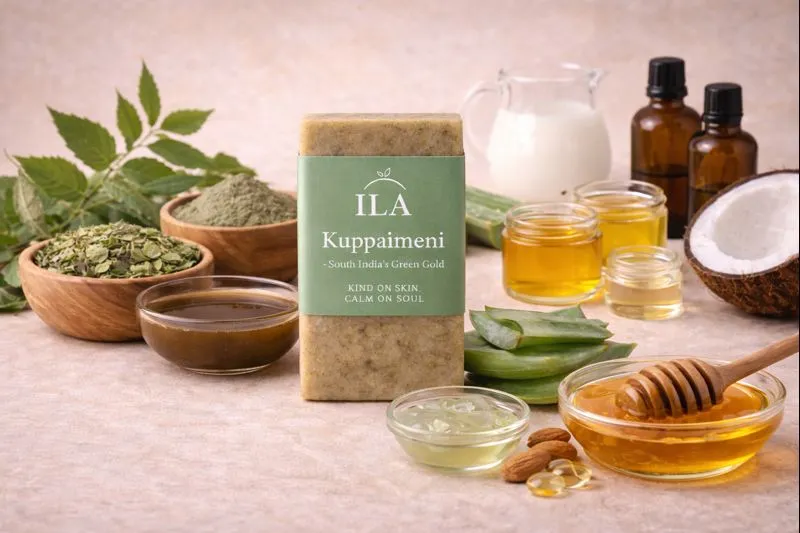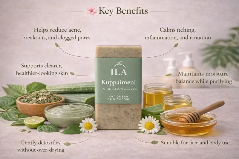 Rooted in traditional South Indian herbal care, Kuppaimeni Soap is designed to support skin clarity while respecting the skin’s natural balance. Kuppaimeni (Acalypha indica), long valued in Siddha and folk medicine, is known for its powerful skin-clearing and detoxifying properties.