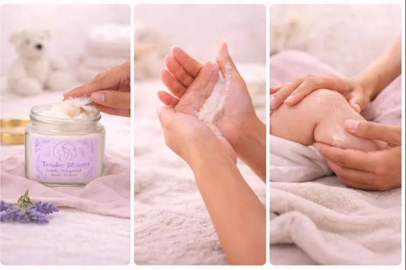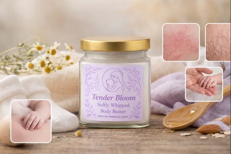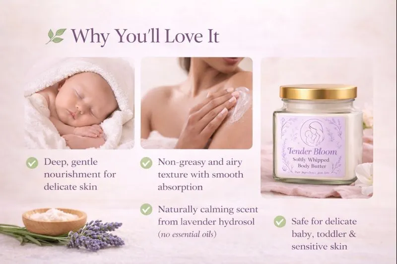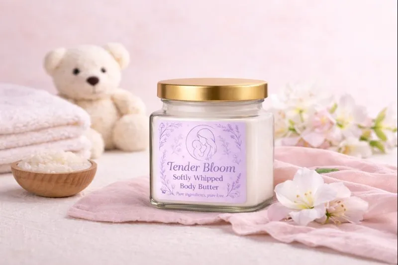 Tender Bloom is a feather-light, whipped body butter made for delicate baby and toddler skin. It melts effortlessly to soothe, nourish, and protect without greasiness. Gentle, calming, and perfect for daily care and bedtime routines.