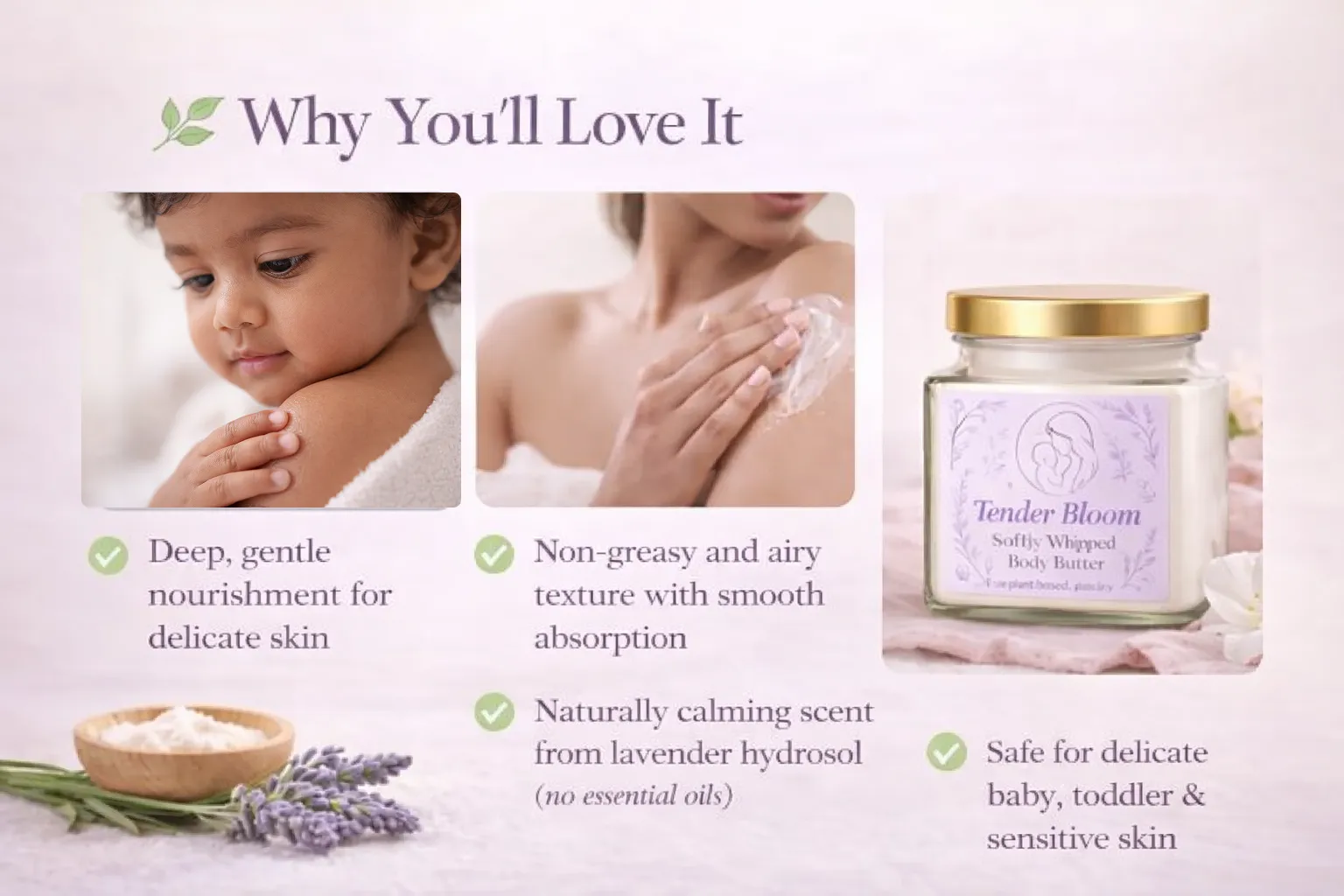 Tender Bloom is a softly whipped, ultra-gentle body butter formulated to nourish delicate toddler skin without heaviness. Crafted with nourishing plant butters, lightweight oils, and a touch of lavender hydrosol, it melts effortlessly into the skin.